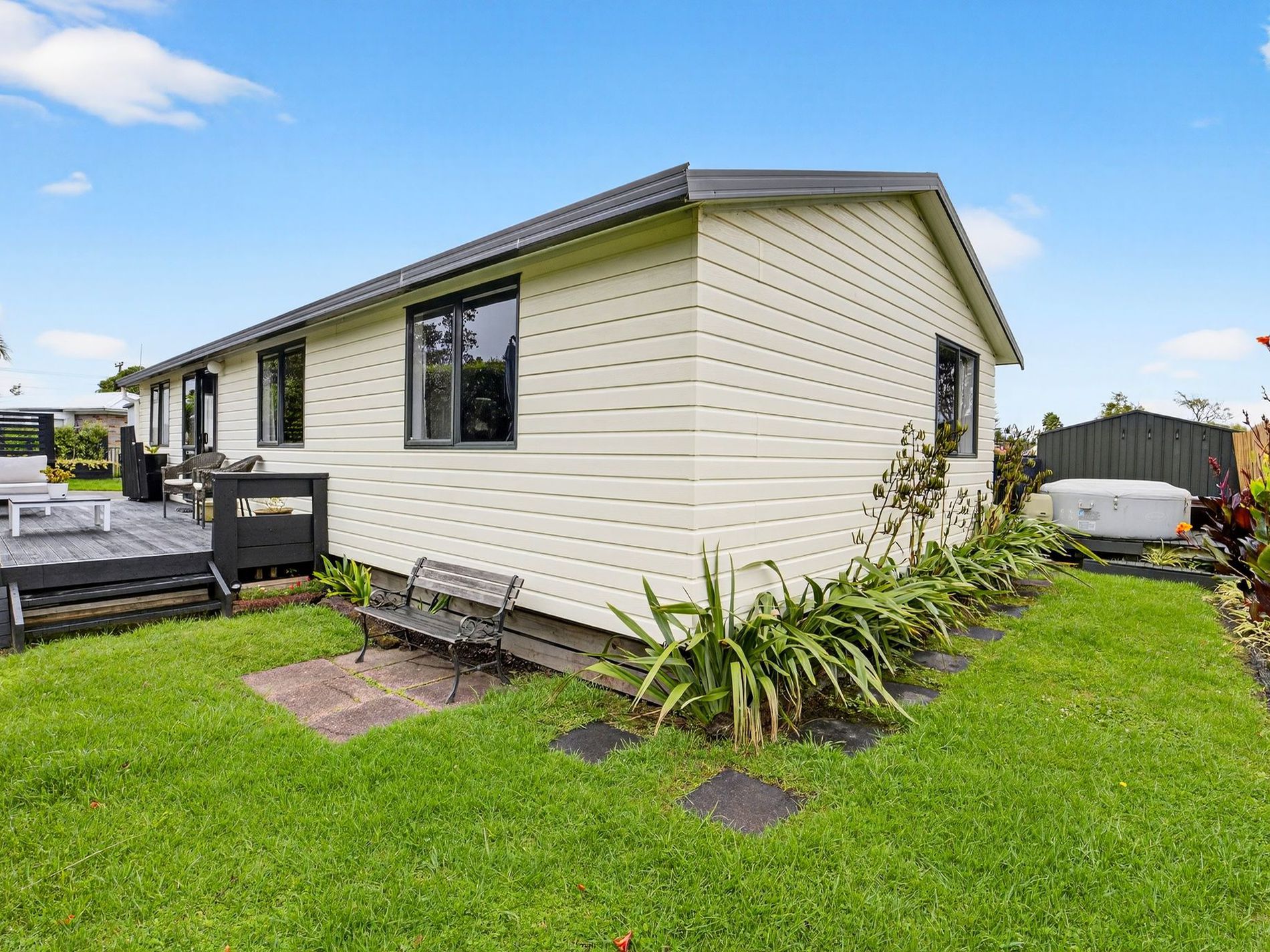 Inside, you'll love the modern open-plan layout, enhanced by striking cathedral ceilings that create a real sense of space and light. The living area flows seamlessly out to a generous deck - the perfect spot for morning coffee, summer BBQs, or relaxed evenings with friends. Outside continues to impress with thoughtful extras including a spa pool nook, double carport, garden shed, and a large sleepout - ideal as a work-from-home space, hobby room, or teen retreat.