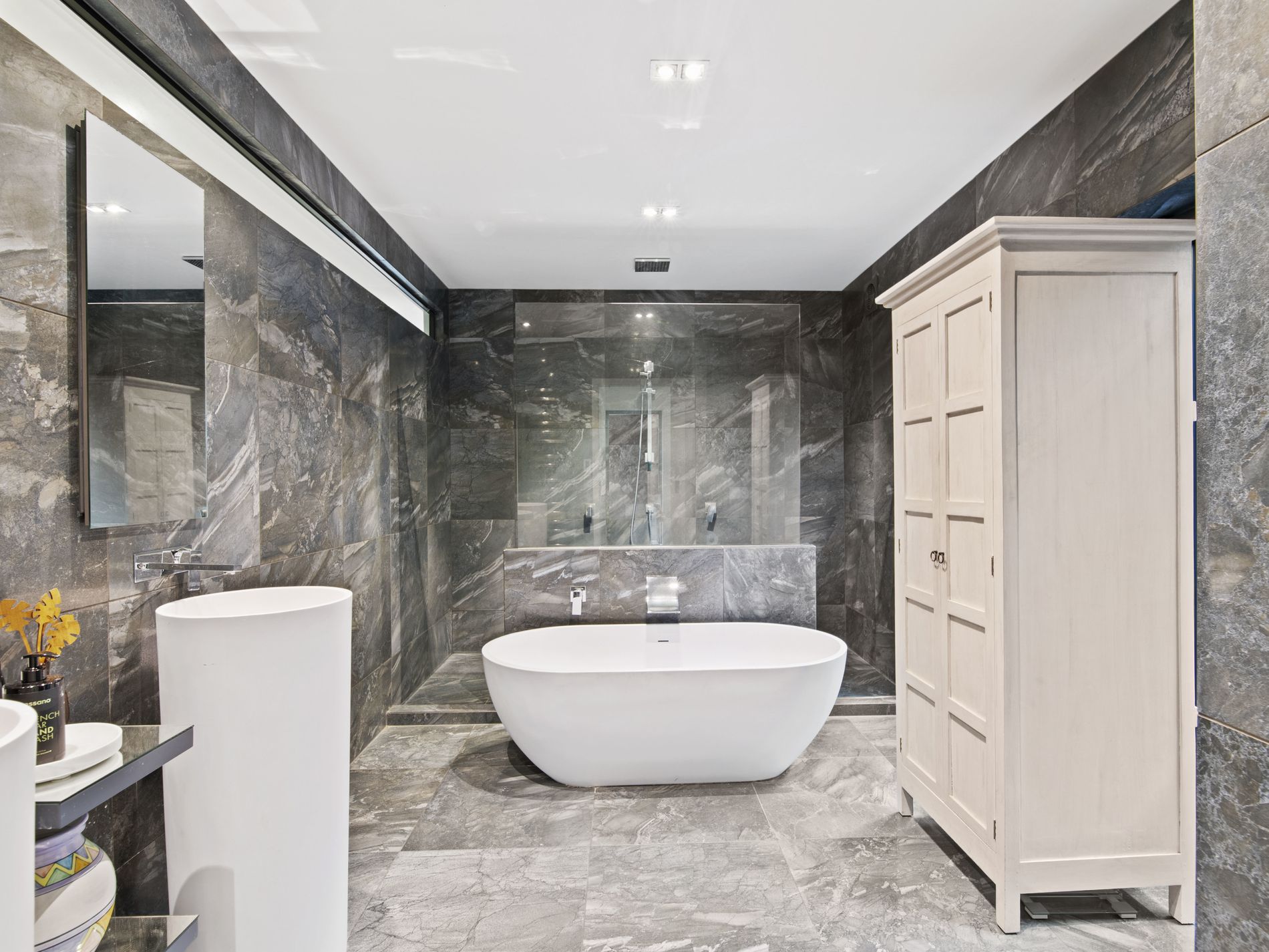 The upper level consists of open plan living and a fabulous well appointed kitchen, each leading out to their own large decks, covered with opening louvers, brilliant for all weather outdoor entertaining and relaxation. In addition to this level is the guest room, a modern family bathroom and large study with built in desk and cupboards.