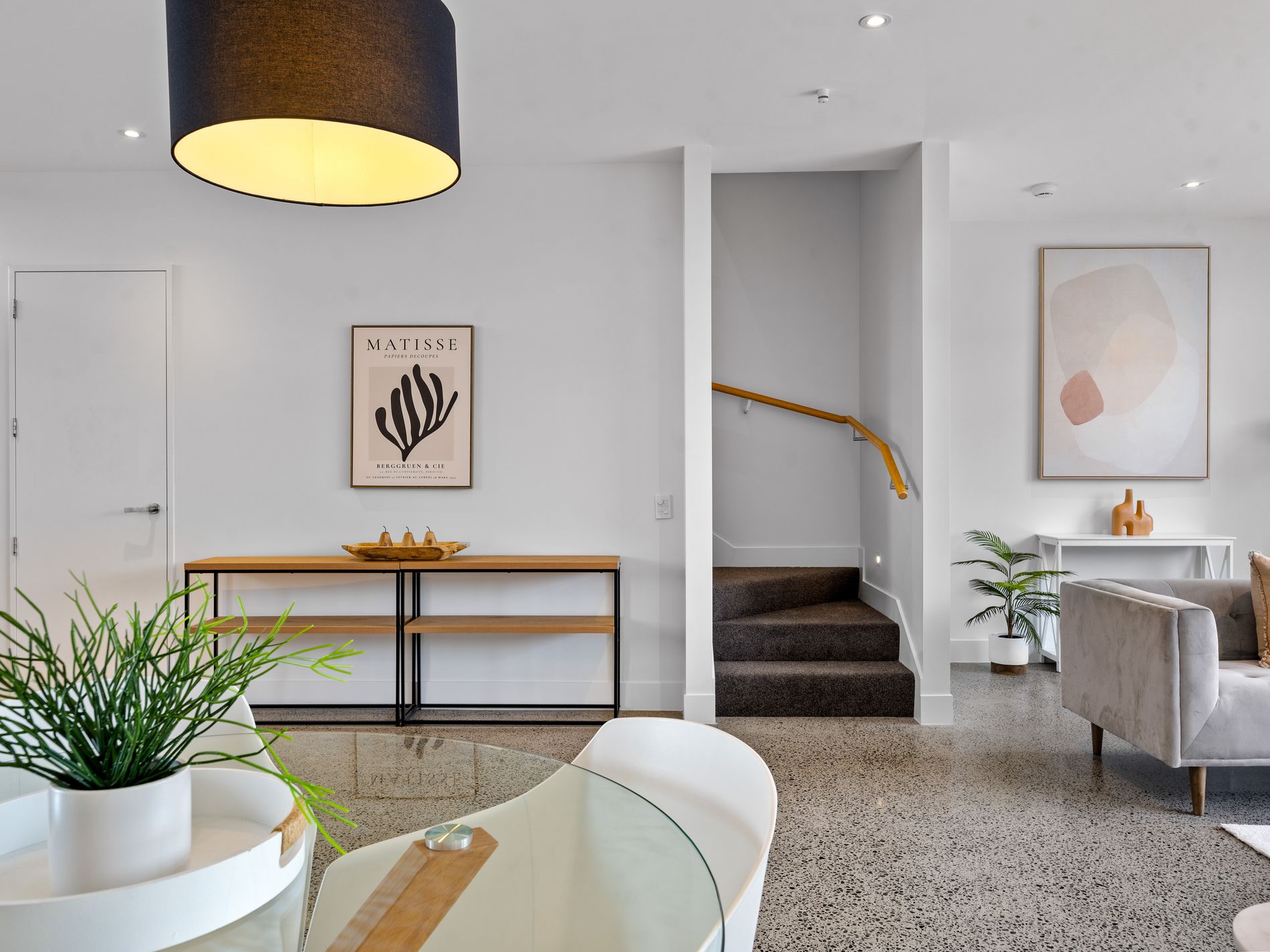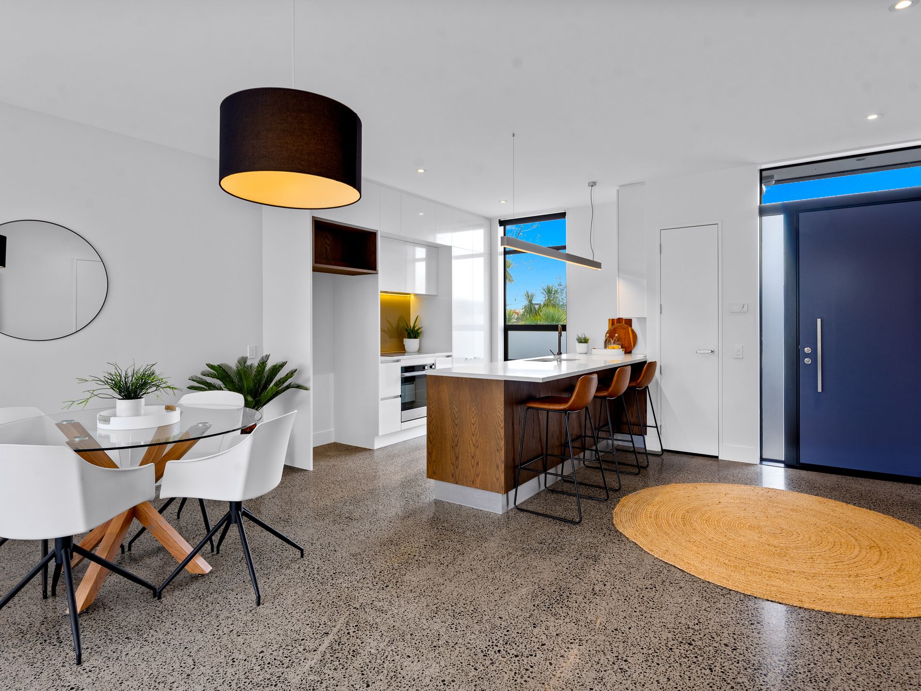 Ground floor offers open plan modern living with a well-appointed kitchen and the convenience of a powder room, complemented by the simply gorgeous polished concrete floors. Second level finds three double bedrooms, ample laundry and linen storage and a stunning white tiled bathroom, complete with bath.