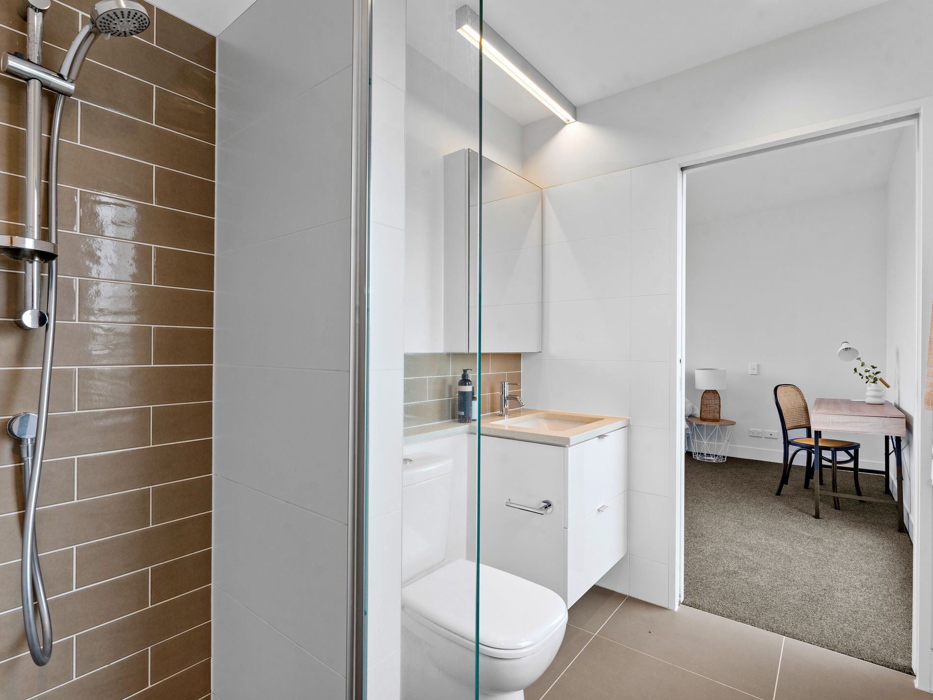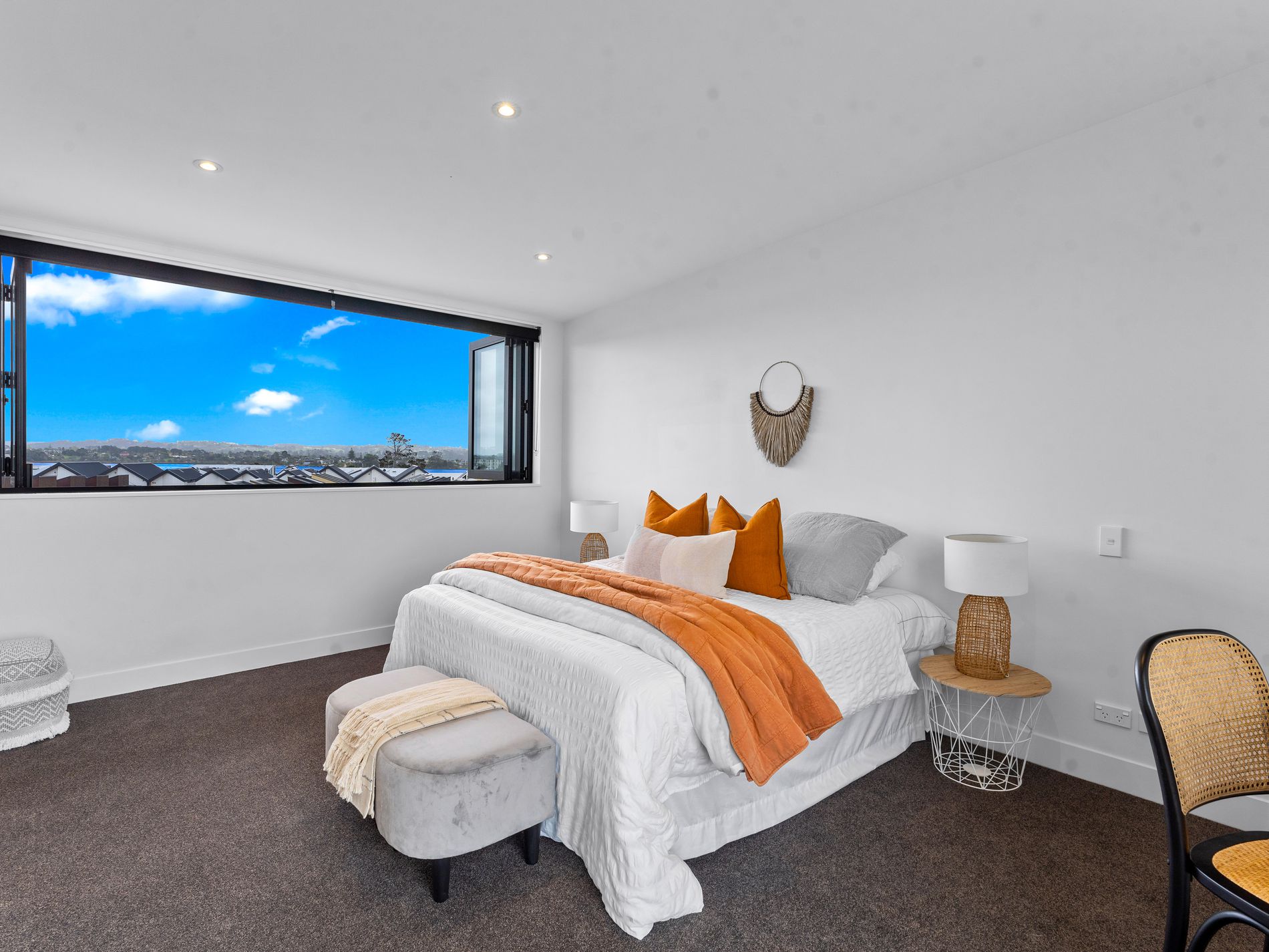 The fabulous master bedroom commands the entire top floor with a huge walk in robe, tiled en-suite and wide views over the water to Herald Island. Sit down, relax and soak in the sea and the sky, from your private retreat.
