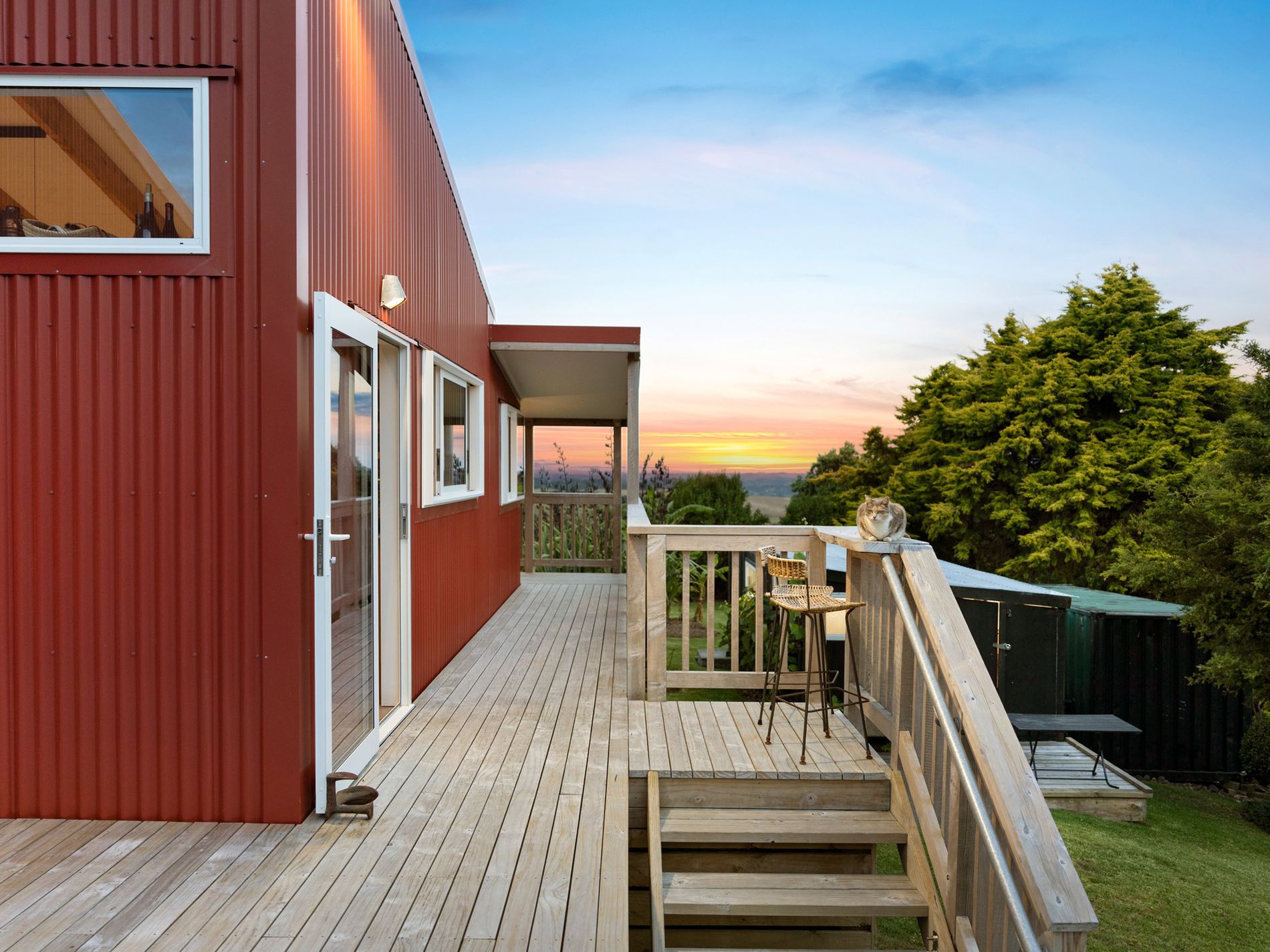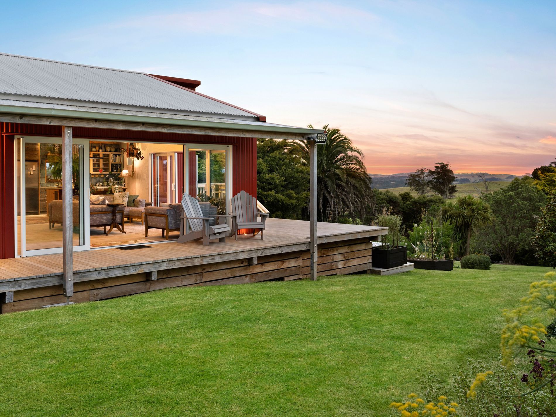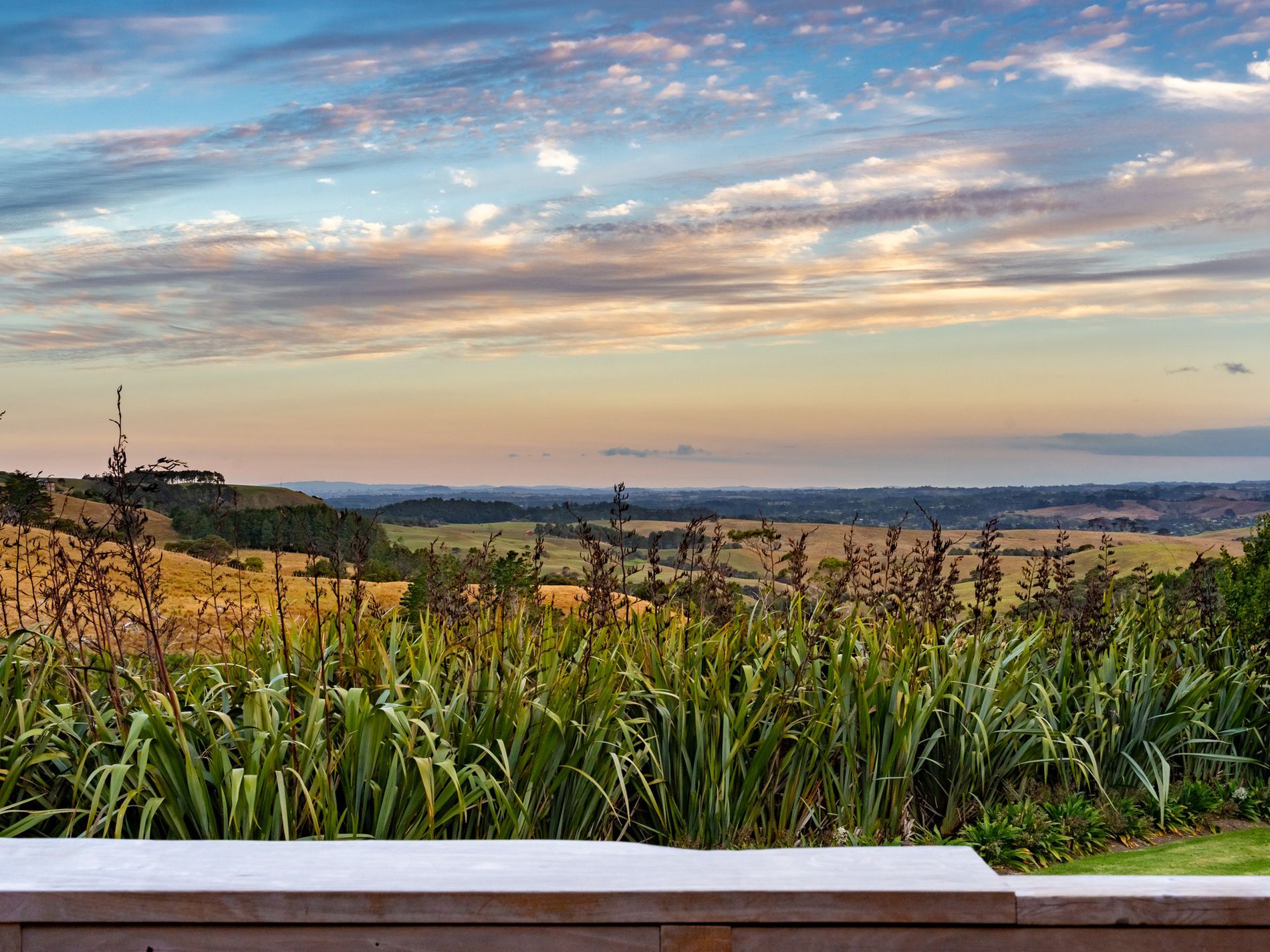 A tranquil property blending bespoke design with functional elegance, nestled in a private park-like setting with sweeping rural vistas including the Kaipara Harbour, Muriwai Beach hills, and the distant Auckland skyline with the iconic Sky Tower. Ideal for artists inspiration.