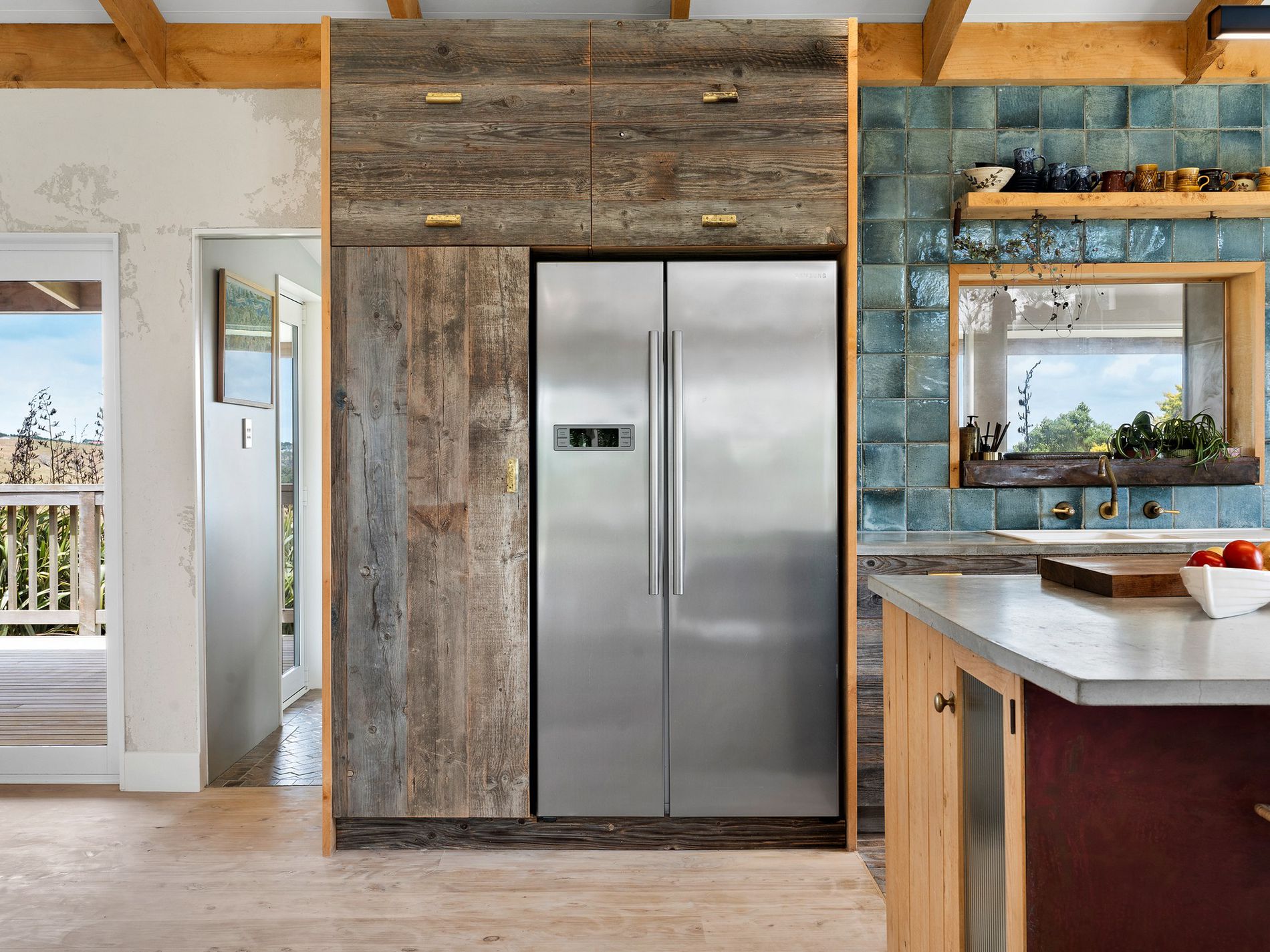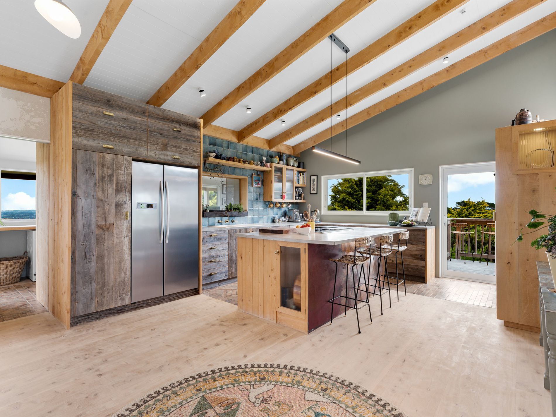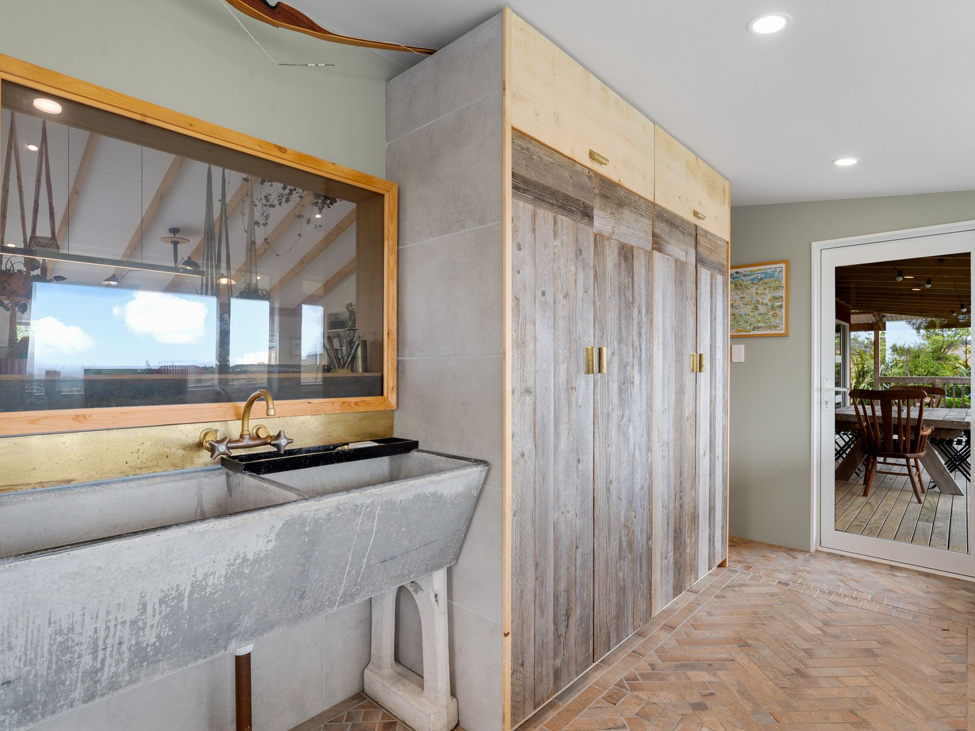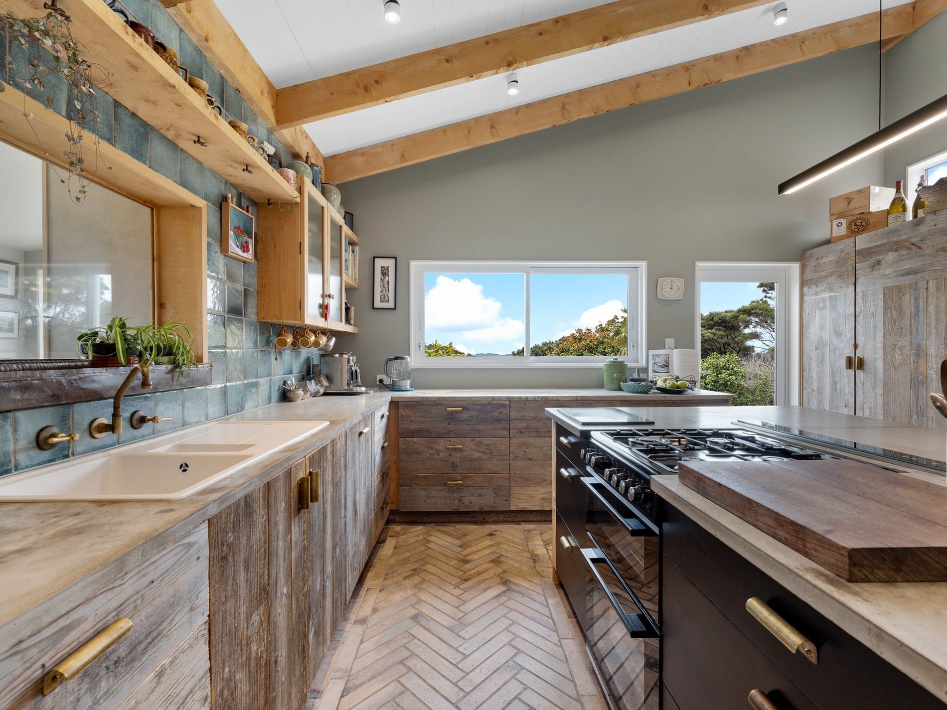 The kitchen, a masterpiece crafted by the owners in the onsite standalone workshop/shed and drawing from their hospitality and design/build backgrounds, boasts underfloor heating, herringbone tiles, salvaged French barn timber cabinetry, forged raw brass tapware, and an in-bench extraction system. An island bench anchors the space, complemented by ample storage and task lighting.