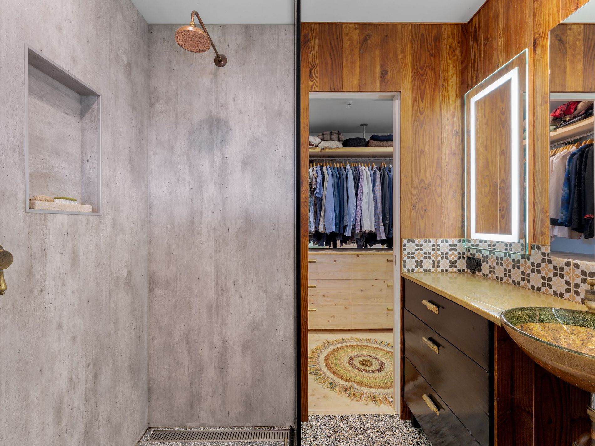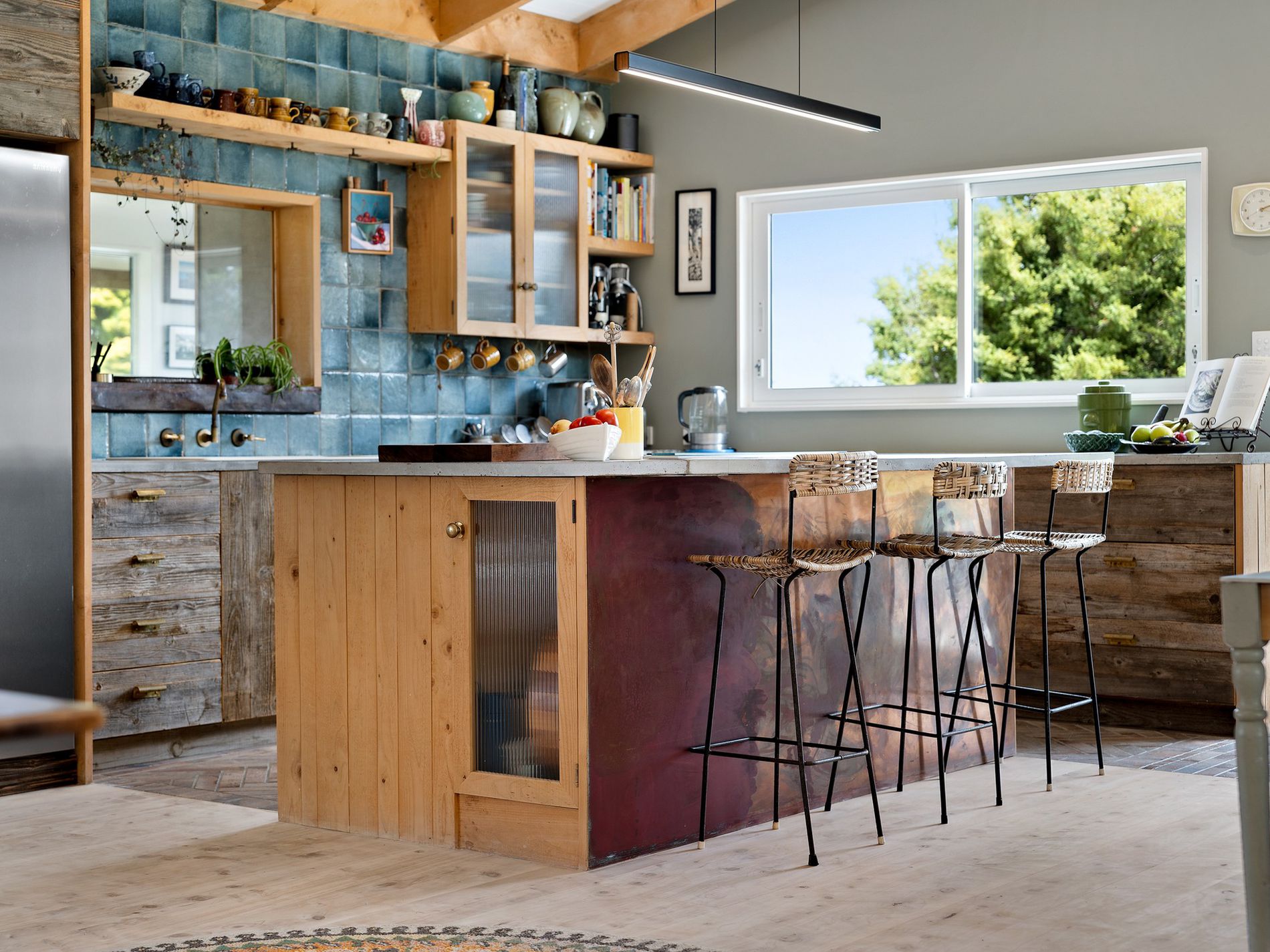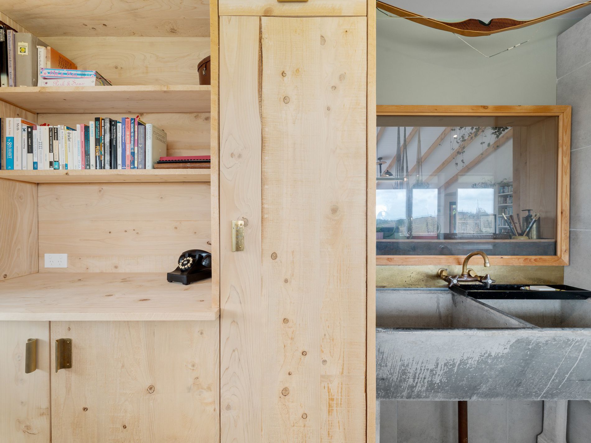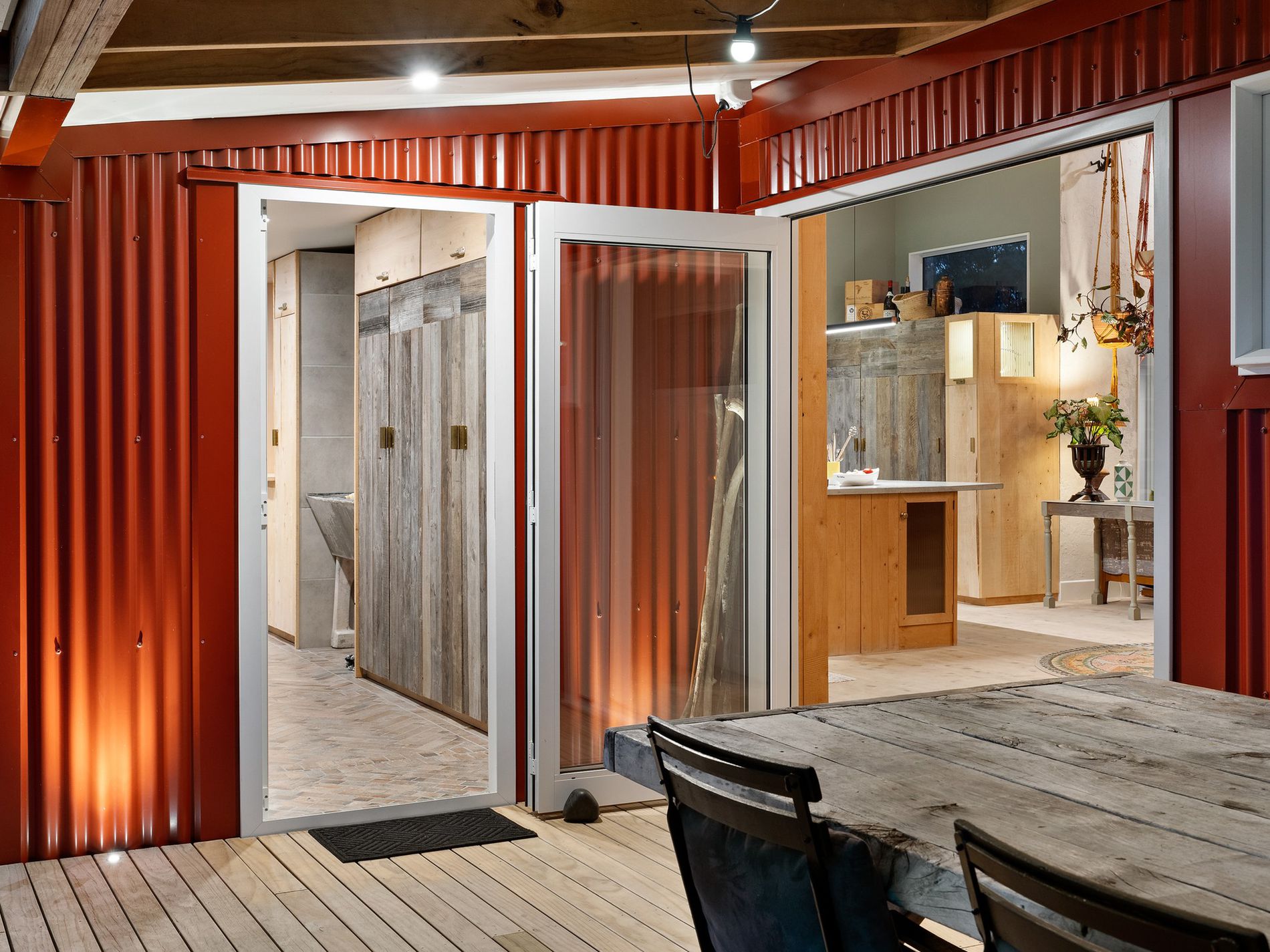 The kitchen, a masterpiece crafted by the owners in the onsite standalone workshop/shed and drawing from their hospitality and design/build backgrounds, boasts underfloor heating, herringbone tiles, salvaged French barn timber cabinetry, forged raw brass tapware, and an in-bench extraction system. An island bench anchors the space, complemented by ample storage and task lighting.