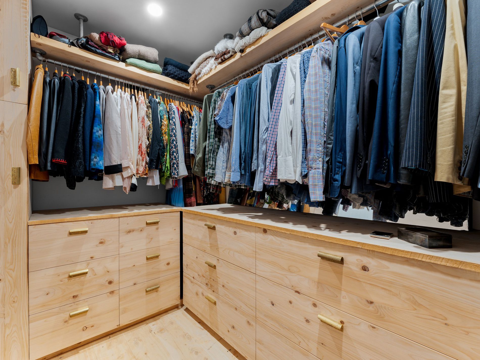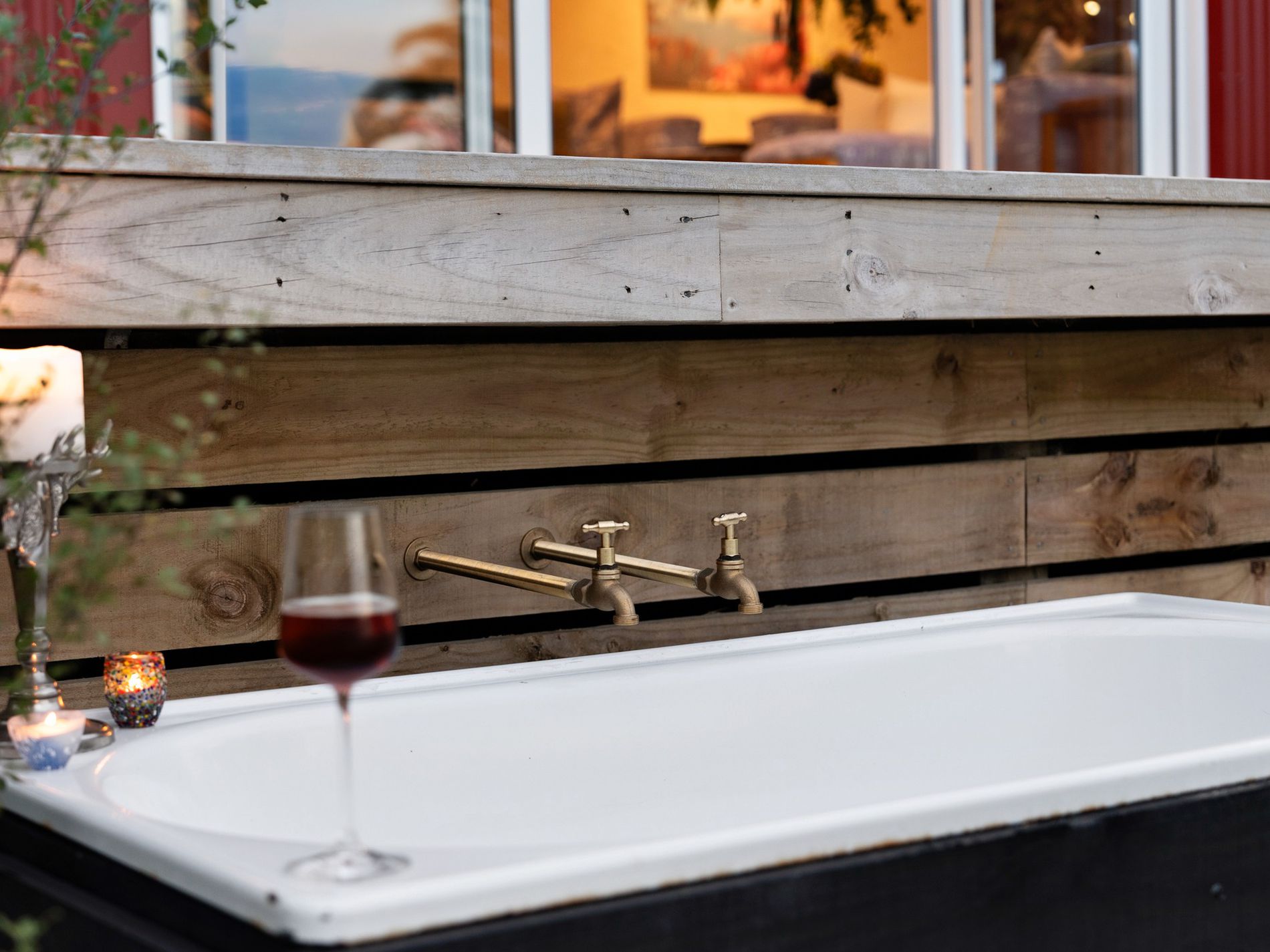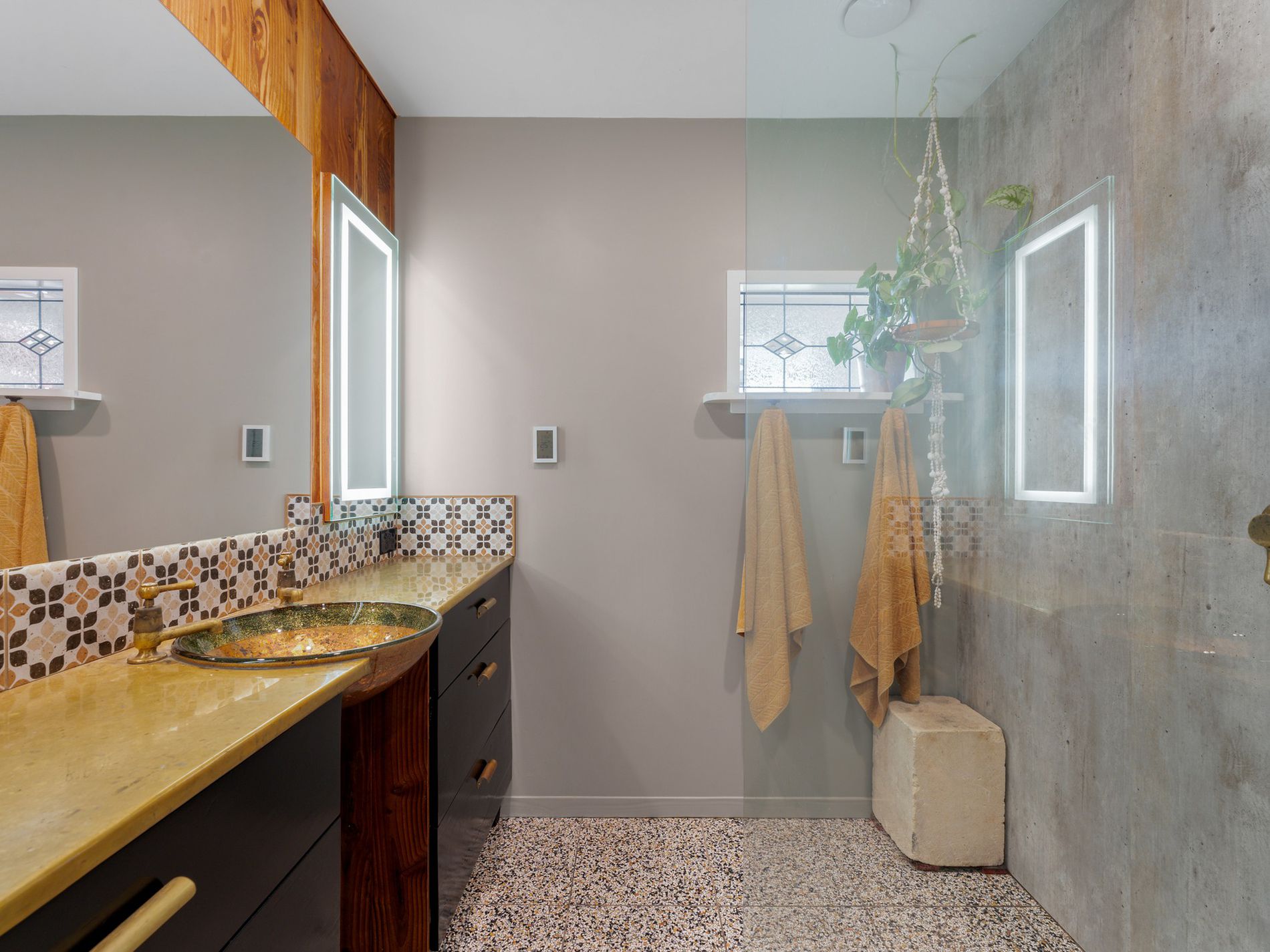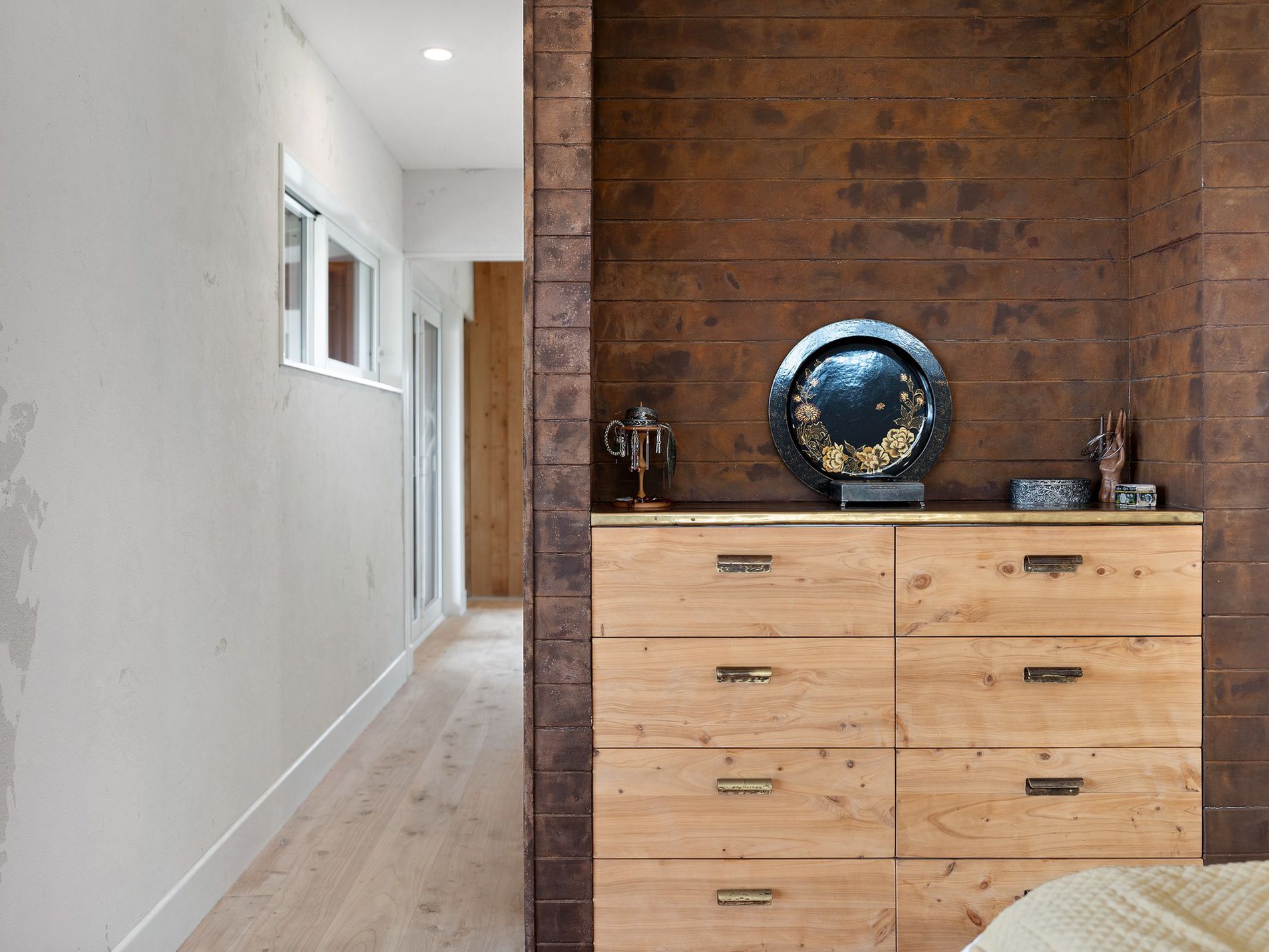 The kitchen, a masterpiece crafted by the owners in the onsite standalone workshop/shed and drawing from their hospitality and design/build backgrounds, boasts underfloor heating, herringbone tiles, salvaged French barn timber cabinetry, forged raw brass tapware, and an in-bench extraction system. An island bench anchors the space, complemented by ample storage and task lighting.
