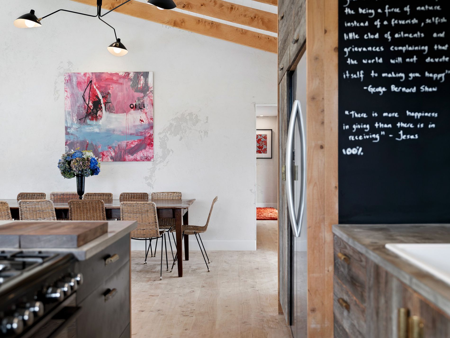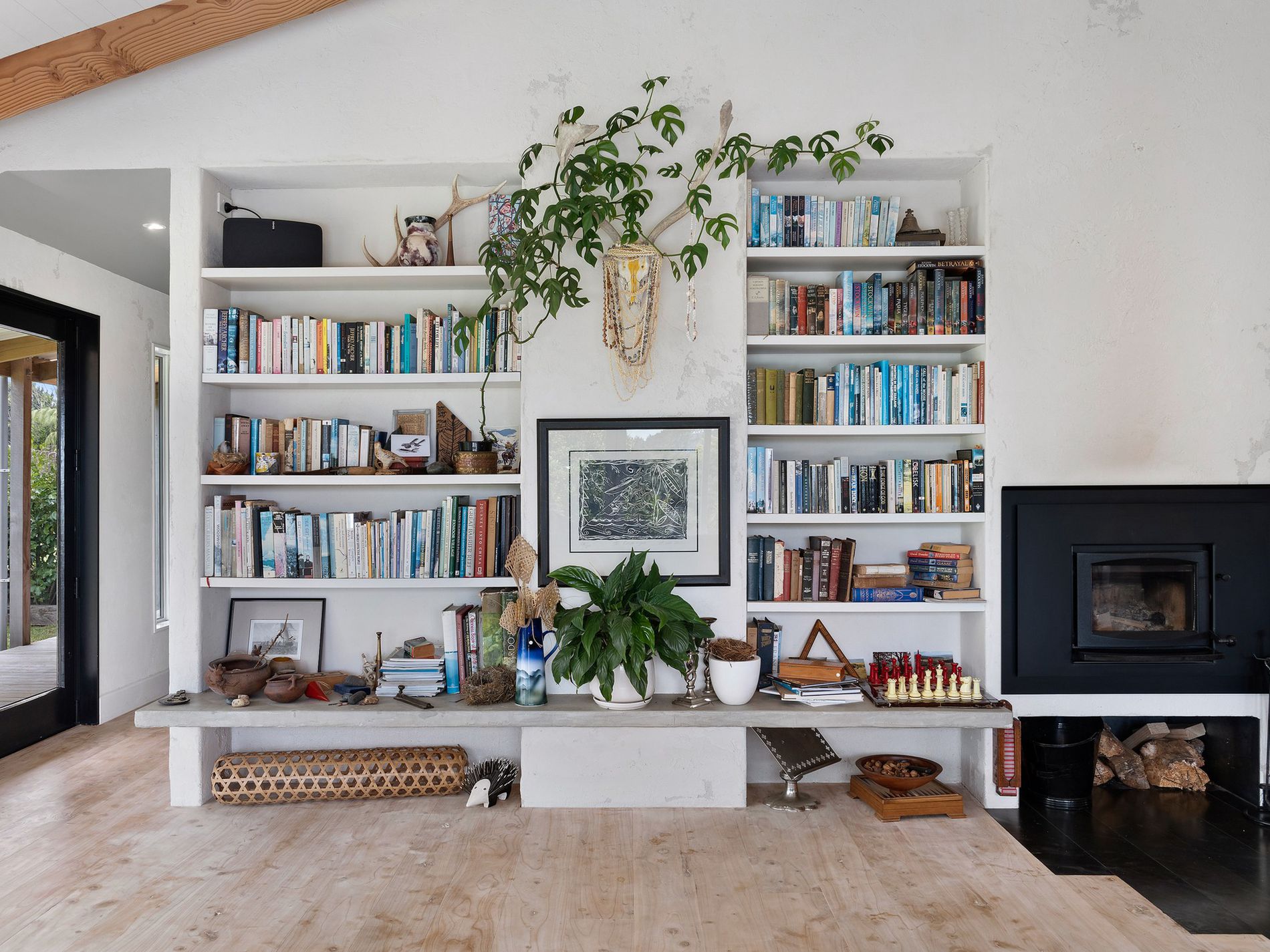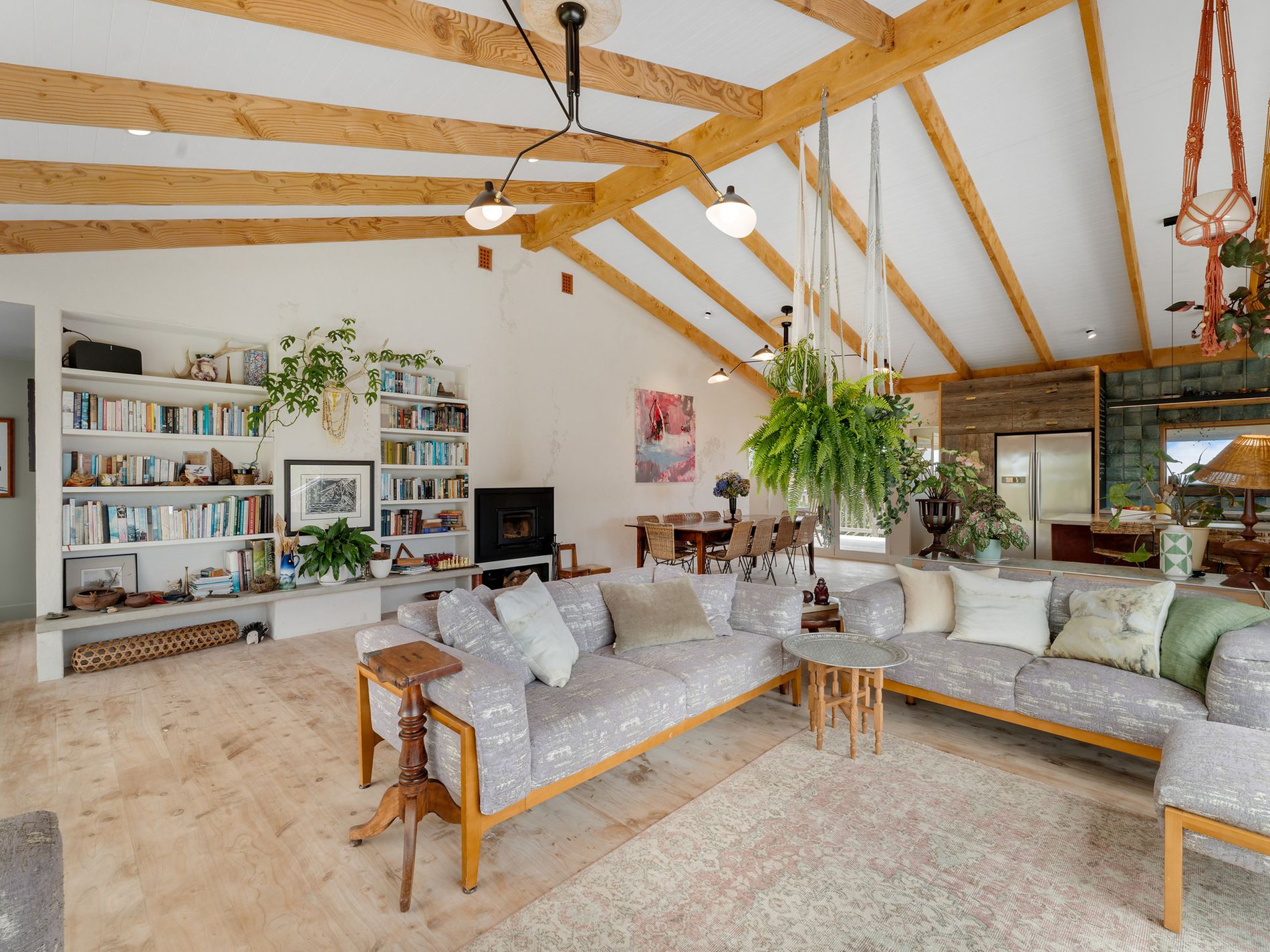 Immaculately maintained inside and out, this home welcomes natural light through expansive windows, perfect for relaxing while watching hawks glide over the fields. Ideal for entertaining, the open plan lounge and dining areas feature lime plaster walls, timber flooring, a cathedral ceiling with exposed timber beams, designer lighting, and a cozy in-wall fireplace. For cooler months, a temperature-controlled in-ceiling heat transfer system ensures comfort.