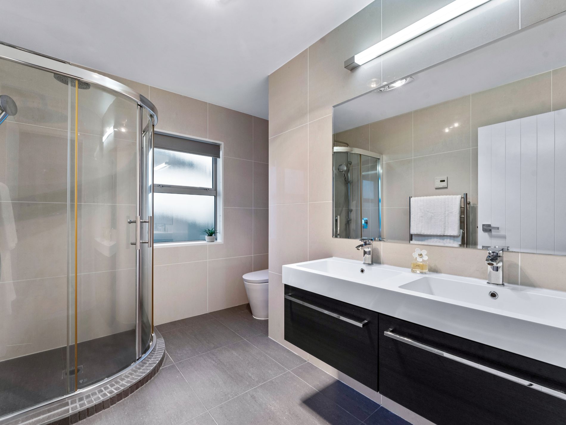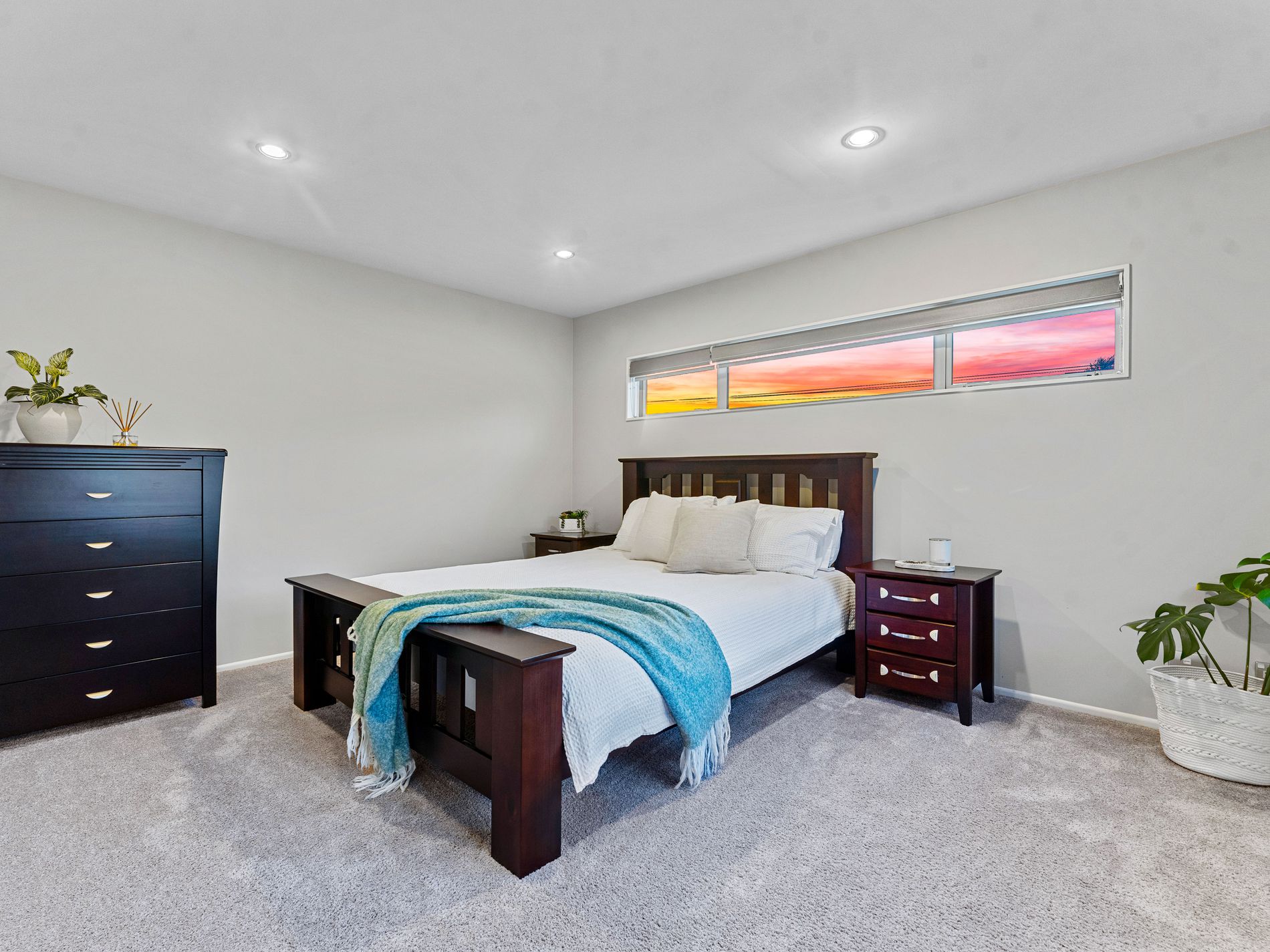 The generous floorplan includes four large bedrooms and two lounges. Upstairs offers three of those bedrooms, including the master with walk in wardrobe and ensuite. This upper lounge takes in stunning views of Rangitoto Island and flows out to a lovely wide covered balcony.